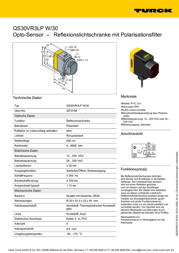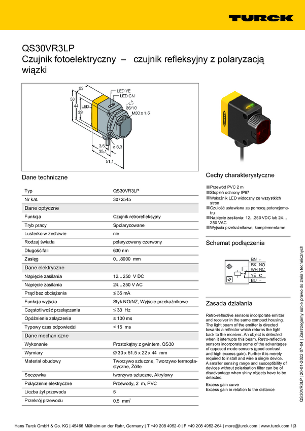 Fotokomórka odbiciowa Turck QS30VR3LP W/30 3073198 1 szt.