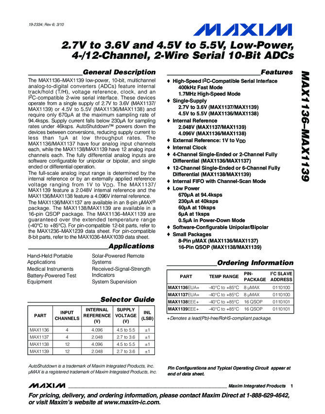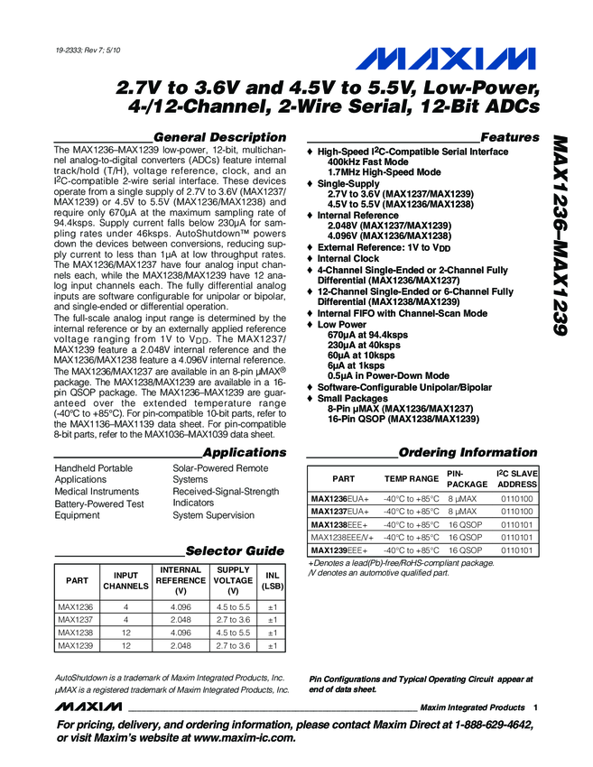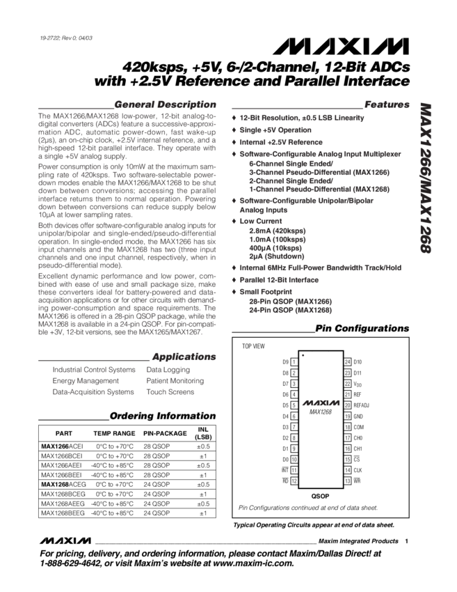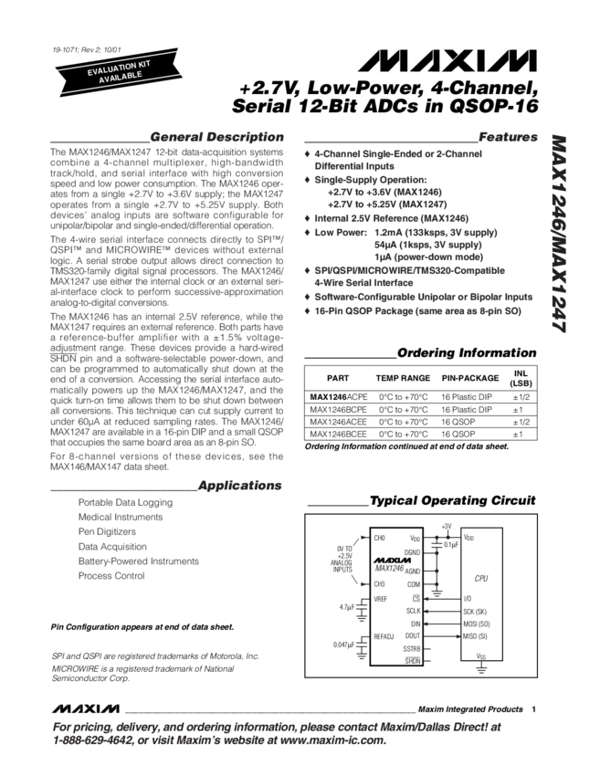 MAX1247 +2.7V to +5.25V, Low-Power, 4-Channel, Serial 12-bit ADC in QSOP-16