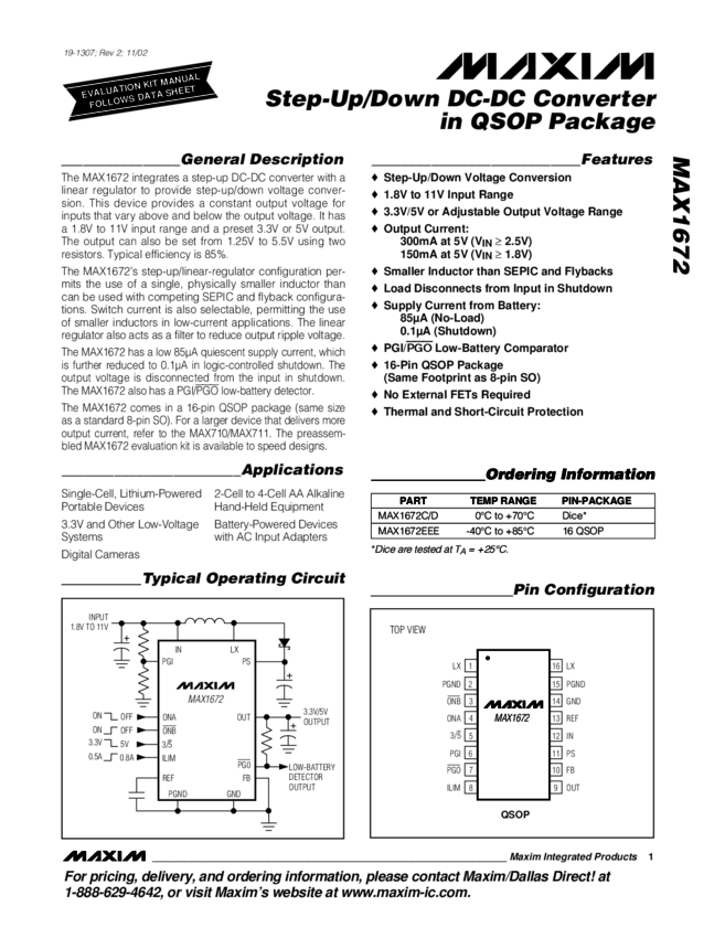 MAX1672 Step-Up/Down DC-DC Converter in a QSOP Package