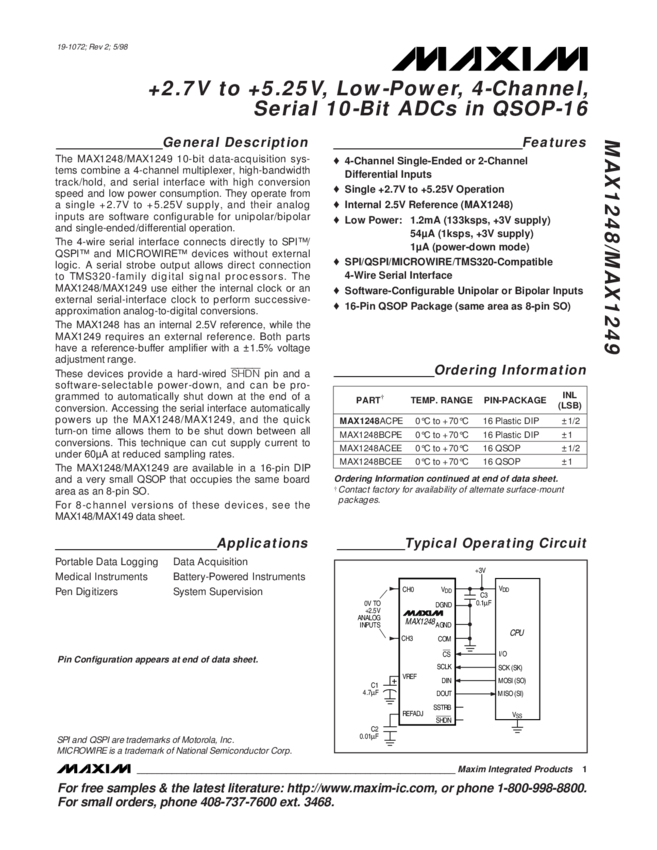 MAX1249 +2.7V to +5.25V, Low-Power, 4-Channel, Serial 10-bit ADC in QSOP-16