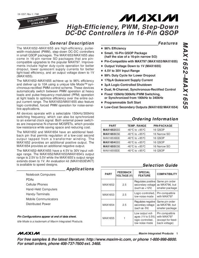 MAX1655 High-Efficiency, PWM, Step-Down DC-DC Converters with Low Output Voltage and Logic-Controlled Low-Noise Mode in QSOP-16