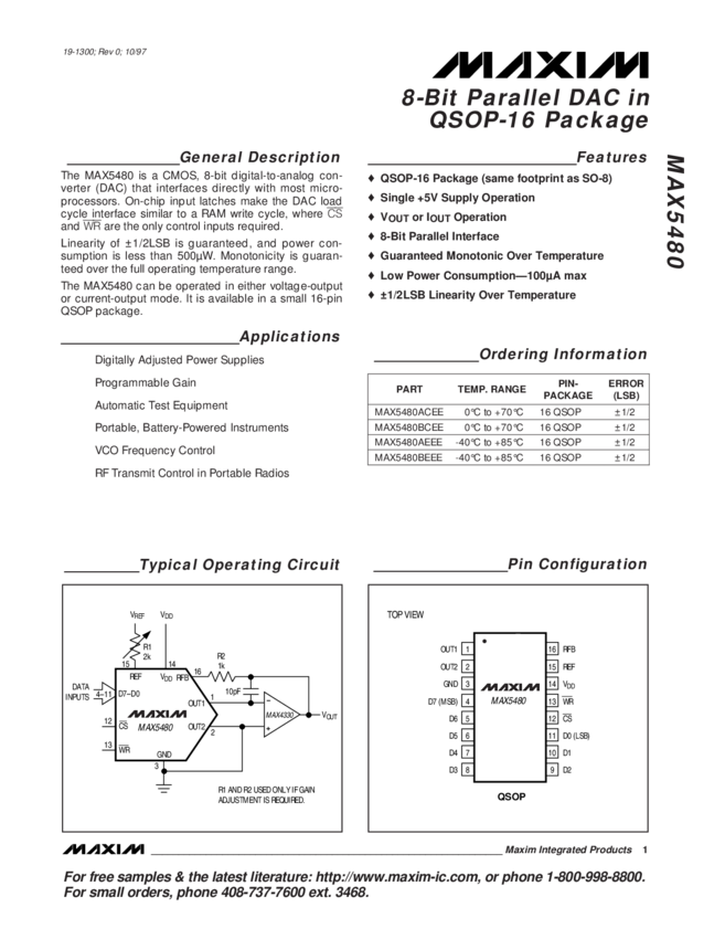 MAX5480 8-Bit Parallel DAC in QSOP-16 Pakage