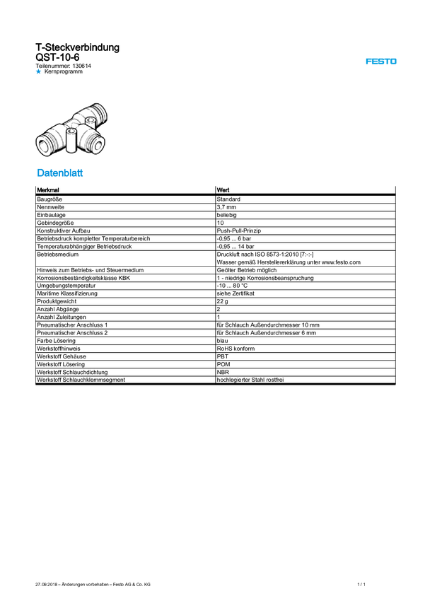 Złączka T FESTO QST-10-6 Średnica rury: 6 mm, 10 mm 1 szt.