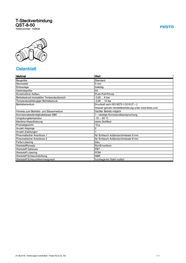 Złączka T FESTO QST-8-50 Średnica rury: 8 mm 1 szt.