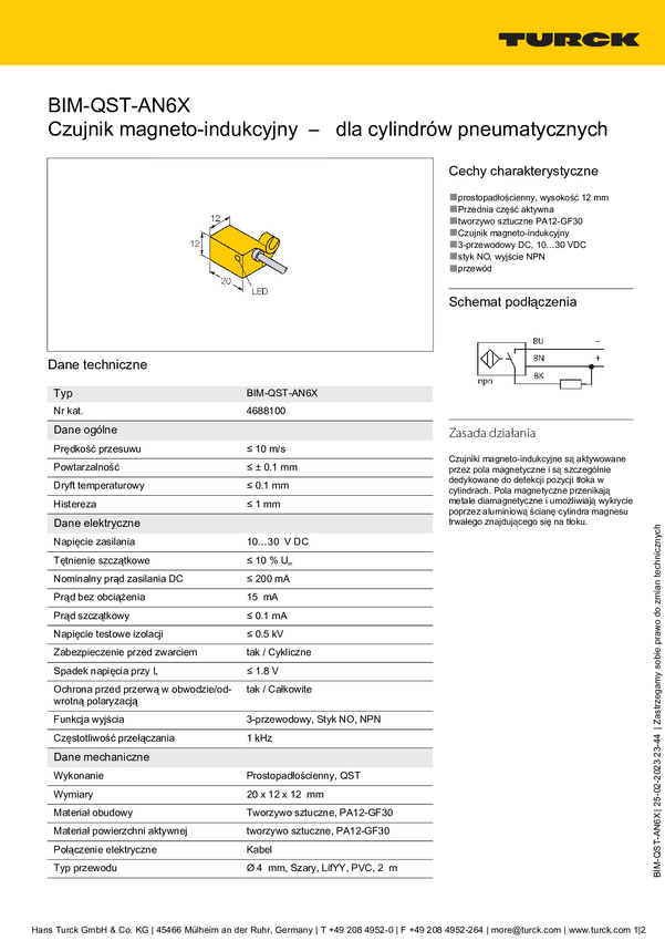 Czujnik pola magnetycznego Turck BIM-QST-AN6X, 10 - 30 V, IP67, 1 szt.