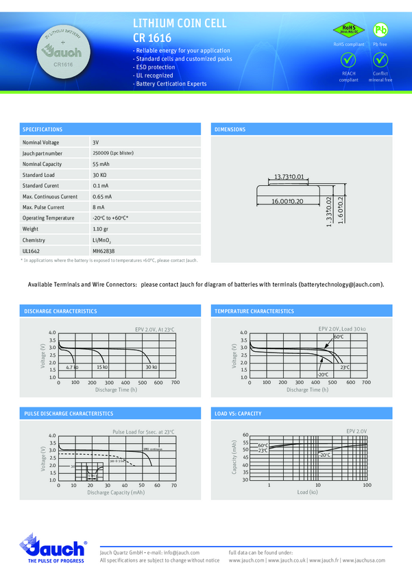 Ogniwo guzikowe CR 1616 Jauch Quartz 3 V 1 szt. 55 mAh litowe