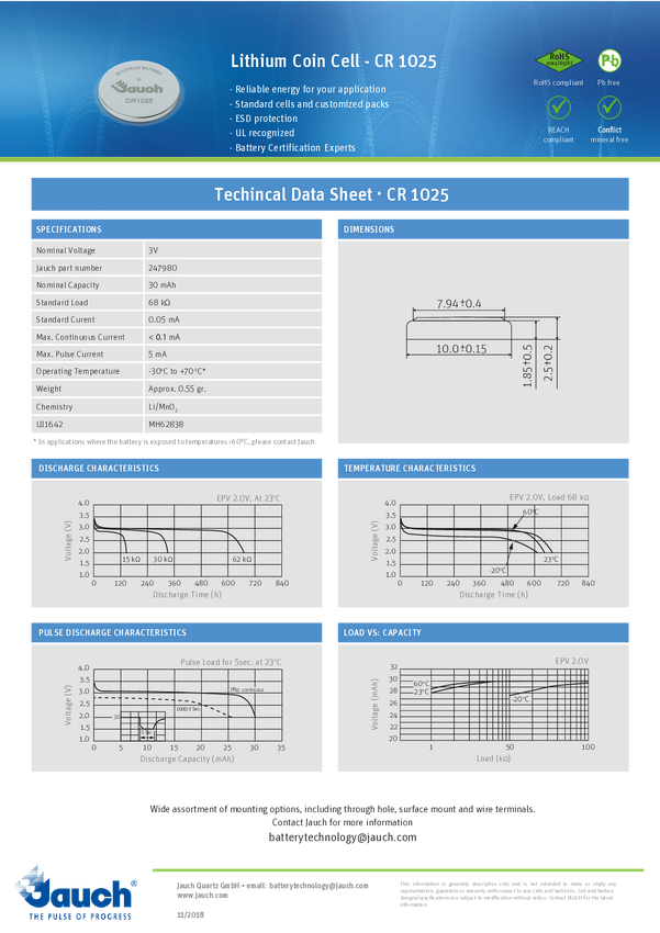 Ogniwo guzikowe CR 1025 Jauch Quartz 3 V 1 szt. 30 mAh litowe