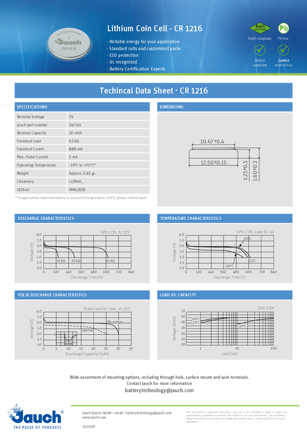 Ogniwo guzikowe CR 1216 Jauch Quartz 3 V 1 szt. 30 mAh litowe