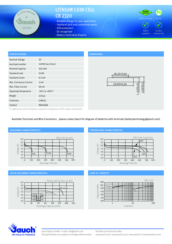 Ogniwo guzikowe CR 2320 Jauch Quartz 3 V 1 szt. 155 mAh litowe
