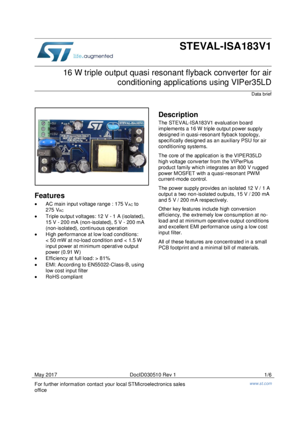 16 W triple output quasi resonant flyback converter for air conditioning applications using VIPer35LD
