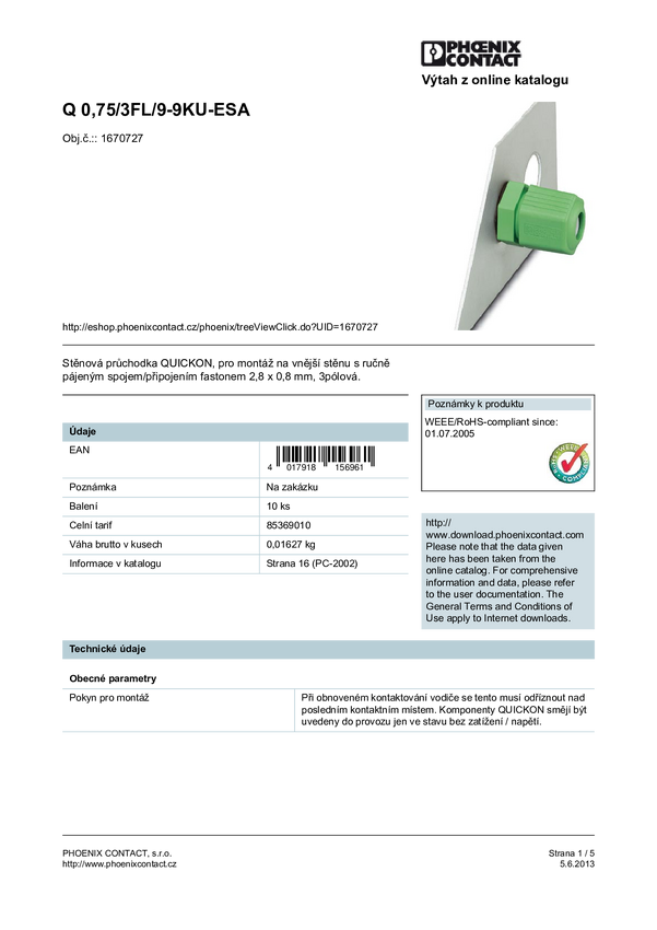 Phoenix Contact 1670727 Dławik kablowy ze złączem męskim okrągłym Seria: QUICKON Łączna ilość styków: 2 + PE 10 szt.