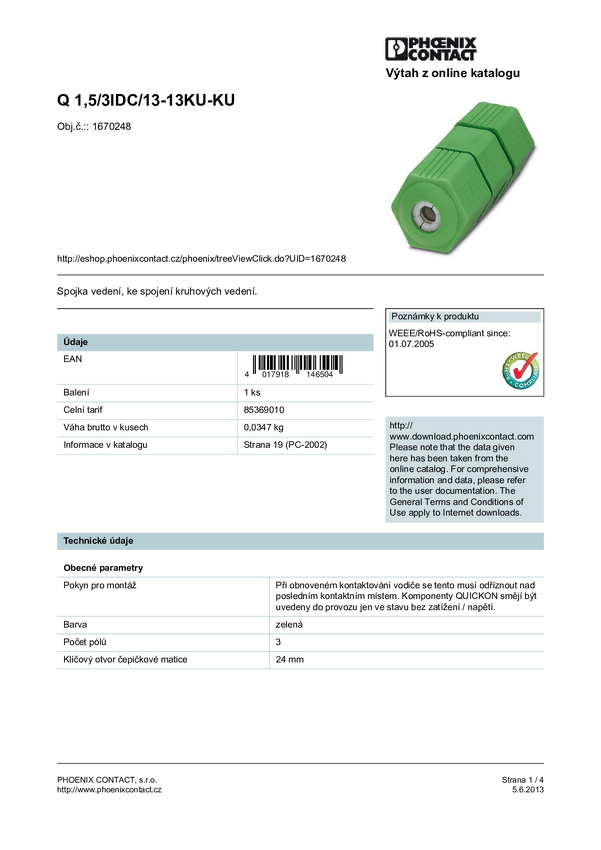 Phoenix Contact 1670248 Złącze liniowe złącze żeńskie do wbudowania Seria: QUICKON Łączna ilość styków: 3 1 szt.