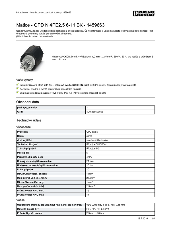 Phoenix Contact 1459663 Nakrętka mocująca złącze męskie okrągłe Seria: QUICKON Łączna ilość styków: 4 + PE 1 szt.