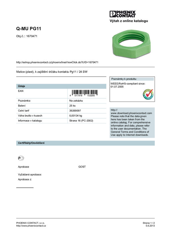 Phoenix Contact 1670471 Nakrętka mocująca złącze męskie okrągłe Seria: QUICKON 25 szt.