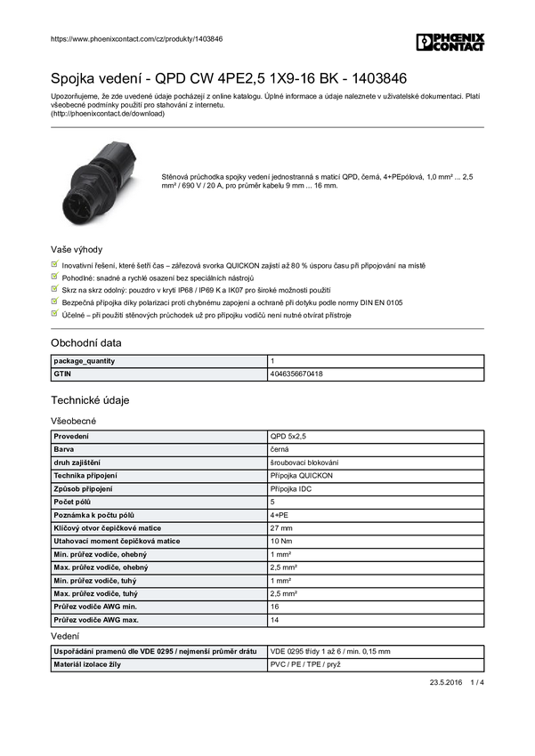 Phoenix Contact 1403846 Złącze okrągłe łącznik przewodów Seria: QUICKON Łączna ilość styków: 4 + PE 1 szt.