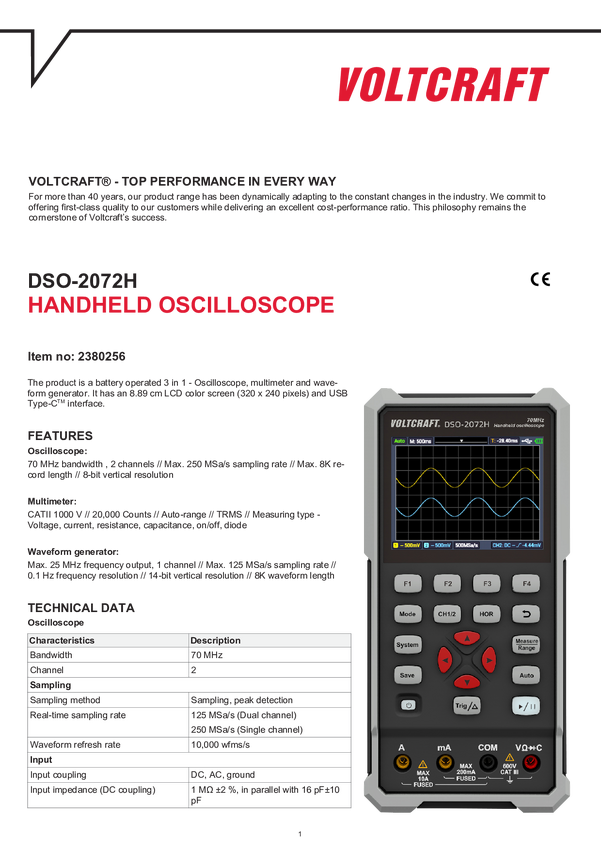 Oscyloskop ręczny VOLTCRAFT DSO-2072H 70 MHz 250 MSa/s Kalibracja (ISO)