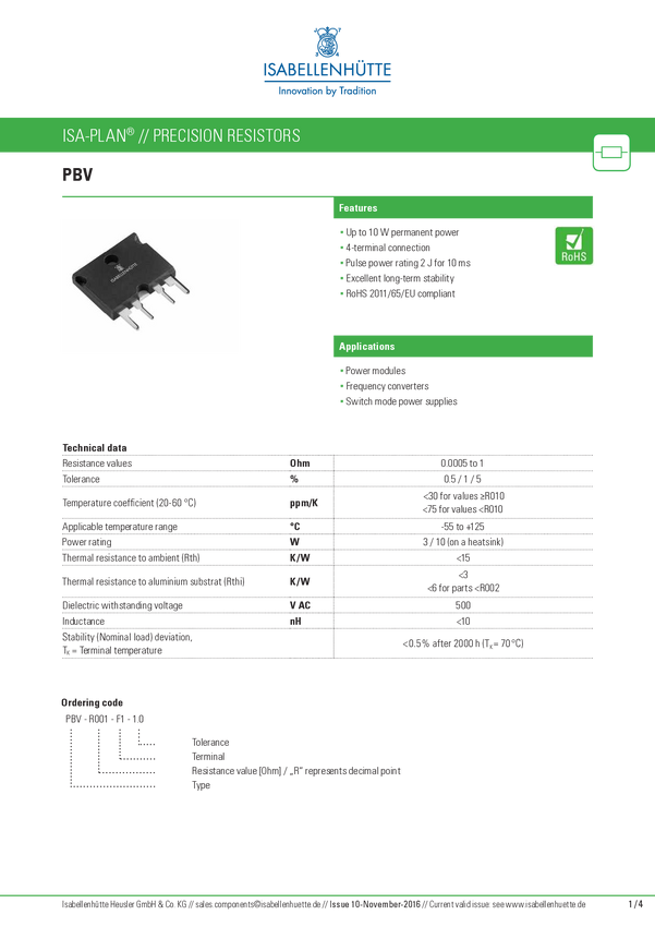 Isabellenhütte PBV-R005-F1-1.0 PBV-R005-F1-1.0 Rezystor metalizowany 5 mΩ THT 10 W 1 % 1 szt.