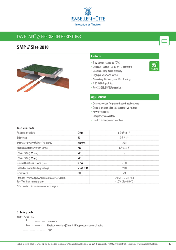 Isabellenhütte SMP-R005-1.0 SMP-R005-1.0 Rezystor SMD 5 mΩ SMD 2010 2 W 1 % 50 ppm/K 1 szt.