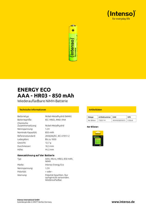Akumulator AAA/R03 Intenso 7505114, NiMH, 850 mAh, 1.2 V, 4 szt.