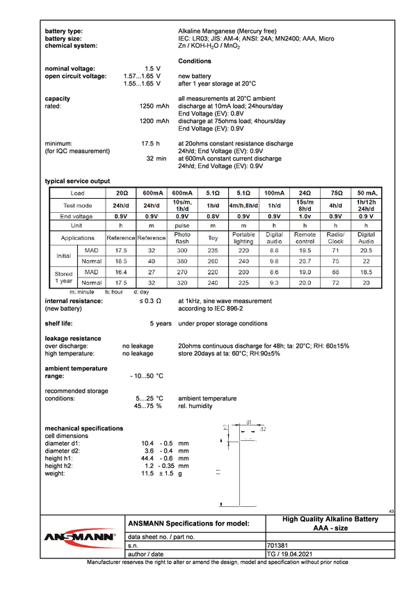 Akumulator AAA/R03 Ansmann 1311-0029, NiMH, 800 mAh, 1.2 V, 2 szt.