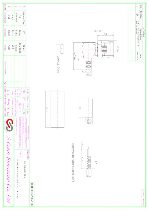 Złącze żeńskie SMA-Reverse, kątowe, 50 Ohm, zaciskane na kablu RG174, styk berylowy złocony 30u", izolator teflon, korpus złocony, narzędzie zaciskające N-HT-H116N (hex size 0.133")
