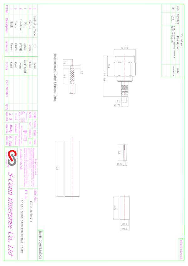 Złącze żeńskie SMA-Reverse, proste, 50 Ohm, zaciskane na kablu RG174, styk berylowy złocony 30u", izolator teflon, korpus złocony, narzędzie zaciskające N-HT-H116N (hex size 0.133")