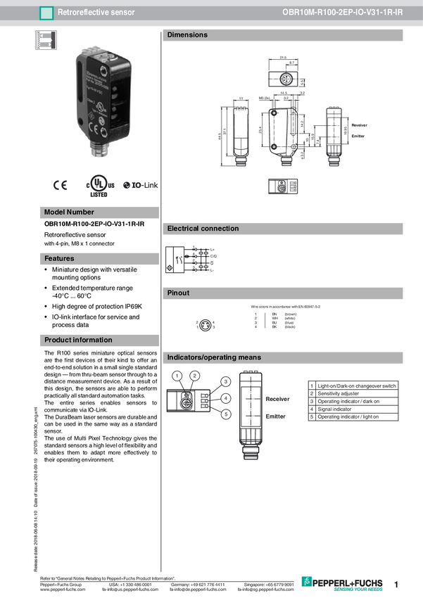 Czujnik fotoelektryczny Pepperl+Fuchs OBR10M-R100-2EP-IO-V31-1R-IR 267075-100430 1 szt.