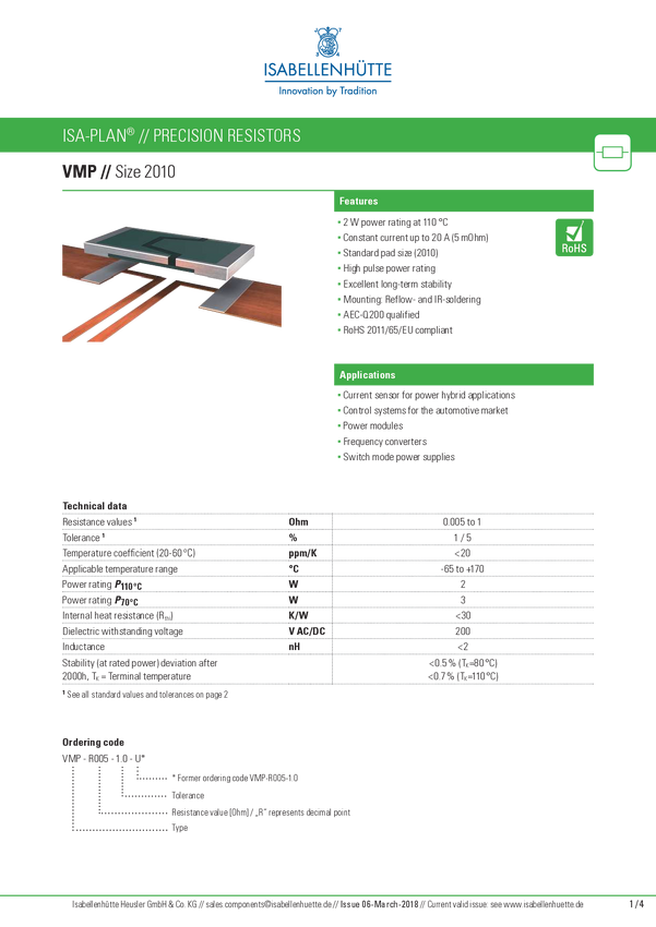 Isabellenhütte VMP-R100-1.0U VMP-R100-1.0U Rezystor SMD 100 mΩ SMD 2010 2 W 1 % 20 ppm/K 1 szt.