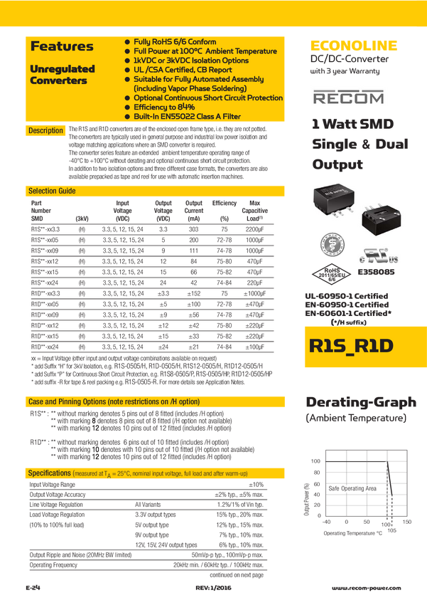 RECOM R1S-0512 Przetwornica DC/DC R1S-0512, 1 W, 12 V, 84 mA, 1 szt.