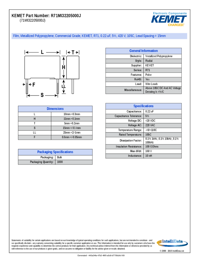 Cap Film 0.22uF 420V PP 5% (18 X 5 X 11mm) Radial 15mm 110°C Loose in Box