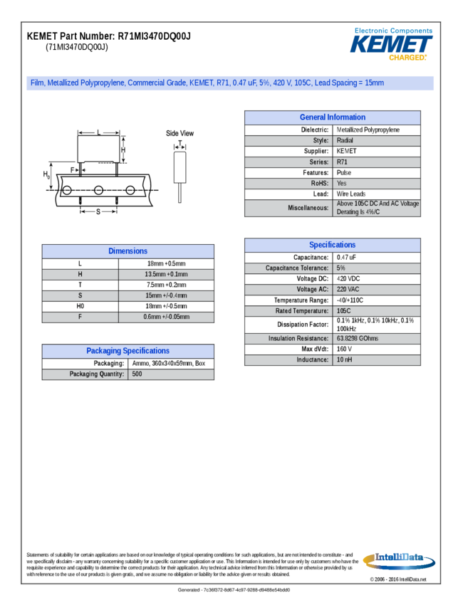Cap Film 0.47uF 420V PP 5% (18 X 7.5 X 13.5mm) Radial 15mm 110°C Ammo Pack