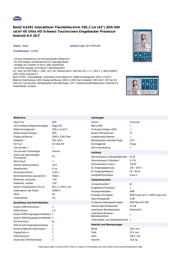 BenQ IL4301 Wyświetlacz Digital Signage EEK: G (A - G) 109.2 cm 43 cal 3840 x 2160 Pixel 24/7
