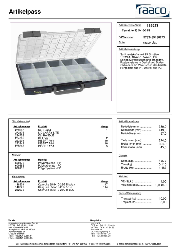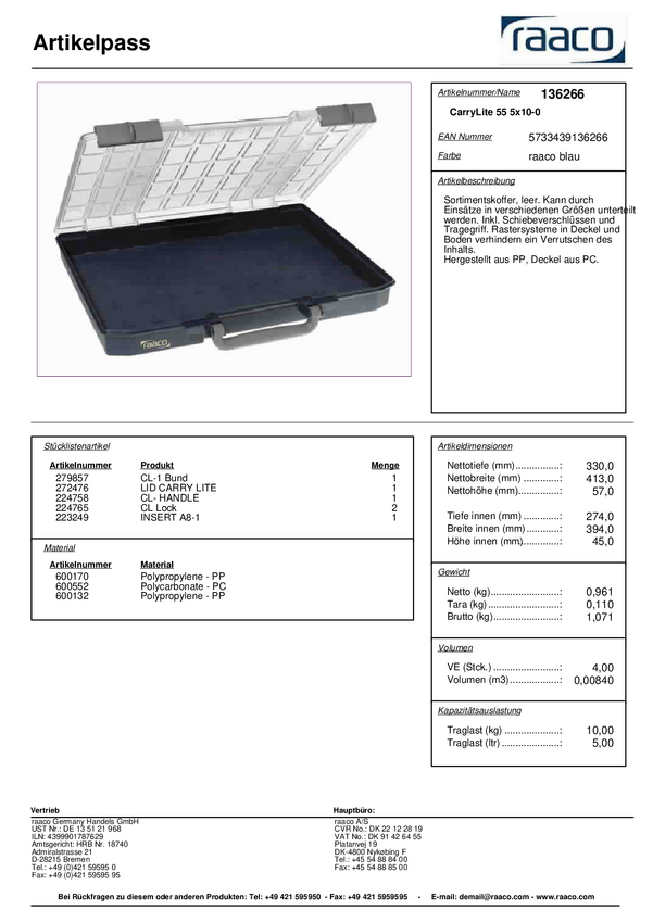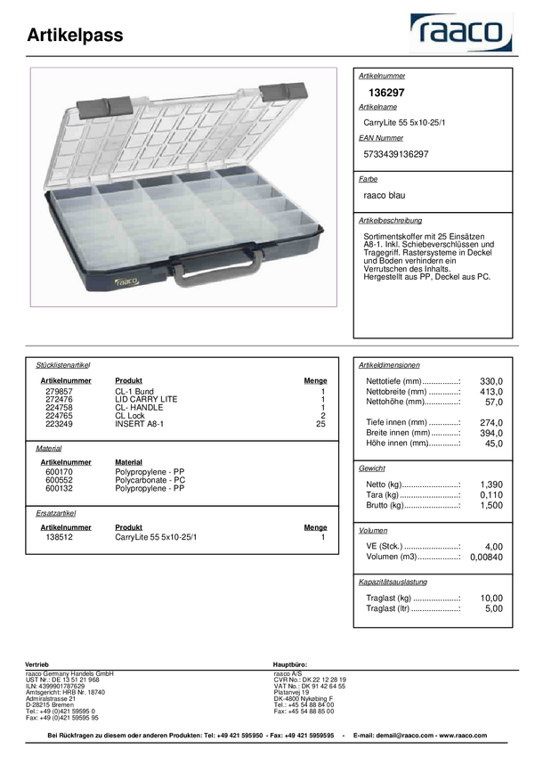 raaco CarryLite 55 5x10-25/2 Walizka (D x S x W) 330 x 413 x 57 mm Ilość przegród: 25 stały podział Content 1 szt.
