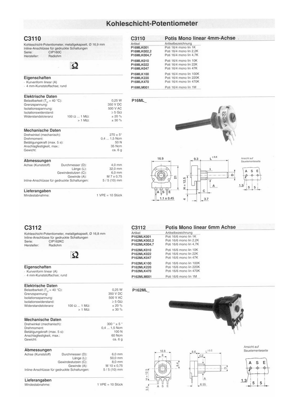 Potencjometr węglowy Radiohm logarytmiczny Bushing M10x0,75 ośka 6mm, dł. 50mm plastyk, szer. 16,8mm, wys. 20,9mm + piny 3,6 mm, raster pinów 5mm; kąt 270 stopni; 0,12W; tol. 20% Rezystancja 4,7 kohm Minimalna ilość 10 sztuk, sprzedajemy tylko jako wielokrotność 10 sztuk