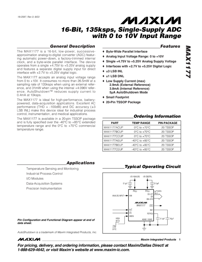 MAX1177 16-Bit, 135ksps, Single-Supply ADC with 0 to 10V Input Range