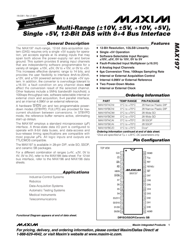 MAX197 Multi-Range (±10V, ±5V, +10V, +5V), Single +5V, 12-Bit DAS with 8+4 Bus Interface