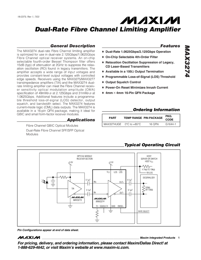MAX3274 Dual-Rate Fibre Channel Limiting Amplifier