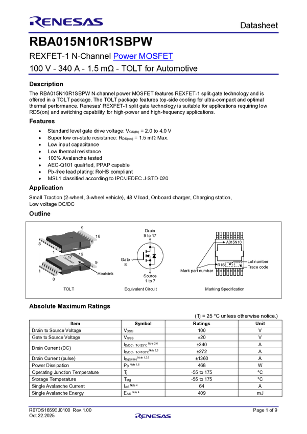 100V, 340A, 1.5mΩ, REXFET-1 N-Channel Power MOSFET in TOLT for Automotive