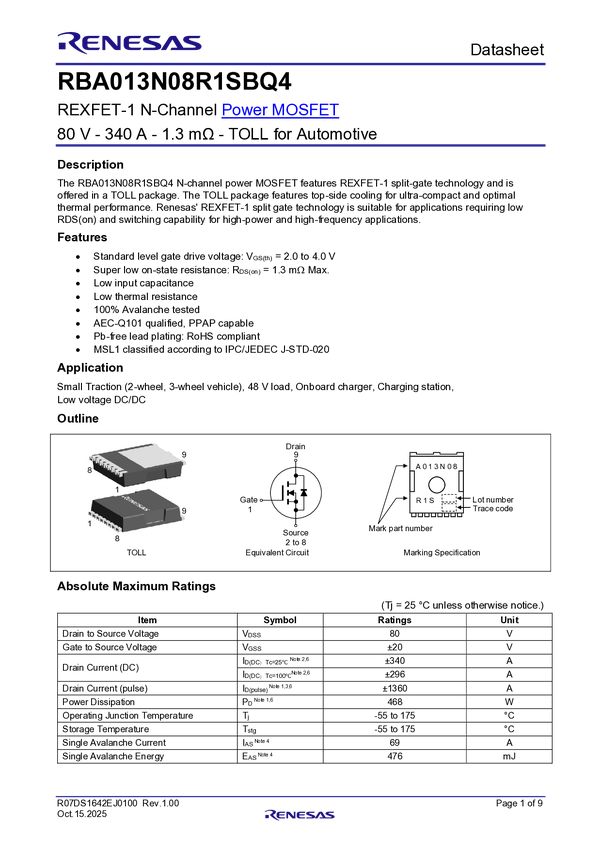 80V, 340A, 1.3mΩ, REXFET-1 N-Channel Power MOSFET in TOLL for Automotive