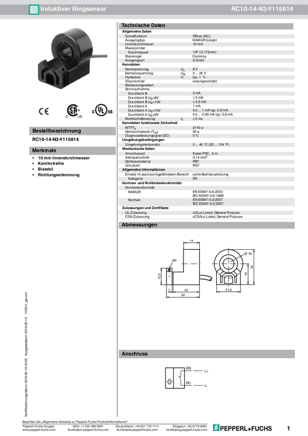 Pepperl+Fuchs Czujnik indukcyjny NAMUR RC10-14-N3-Y115614
