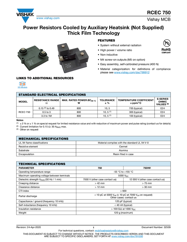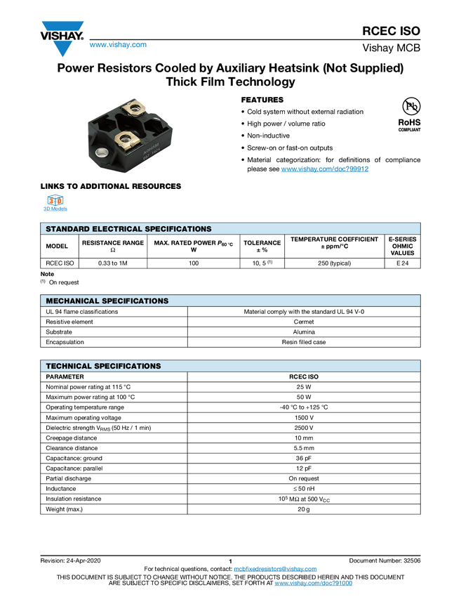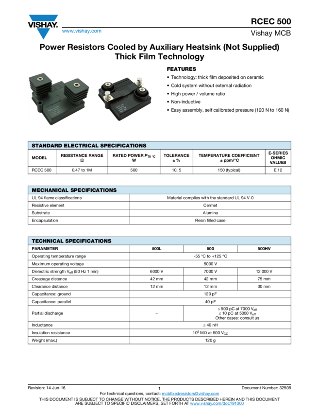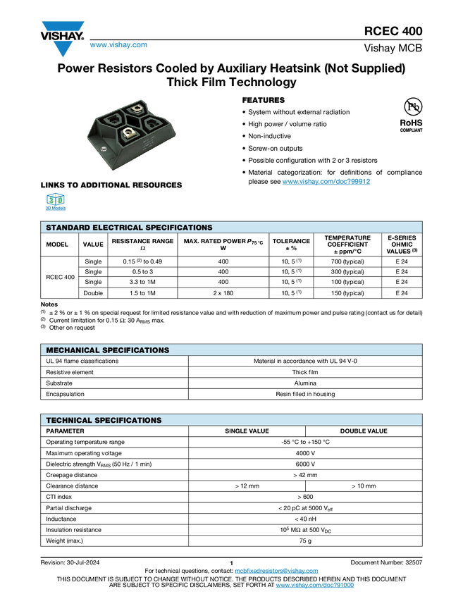 Power Resistors Cooled by Auxiliary Heatsink (Not Supplied) Thick Film Technology