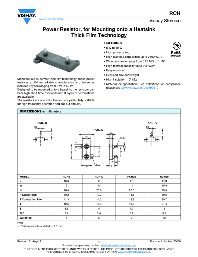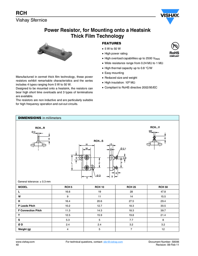 Res Thick Film 5 Ohm 5% 50W ±150ppm/°C Molded RDL Lug Flange Mount Bag