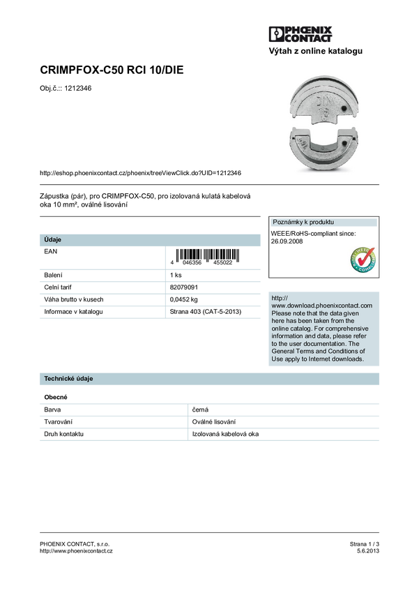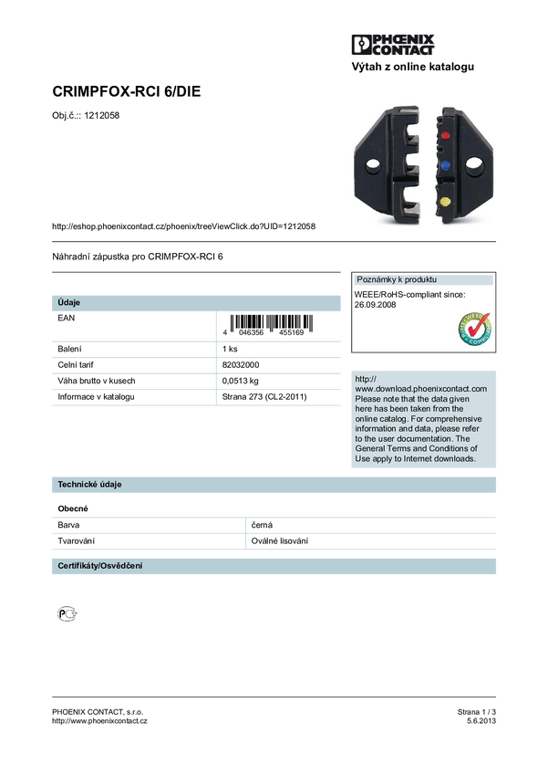 Phoenix Contact CRIMPFOX-RCI 6/DIE 1212058 Matryca do zaciskarki Kompatybilność z markami Phoenix Contact