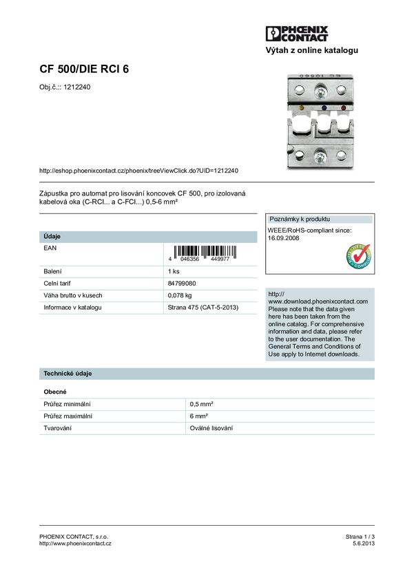 Phoenix Contact CF 500/DIE RCI 6 1212240 Matryca do zaciskarki izolowane końcówki kablowe 0.5 do 6 mm² Kompatybilność z