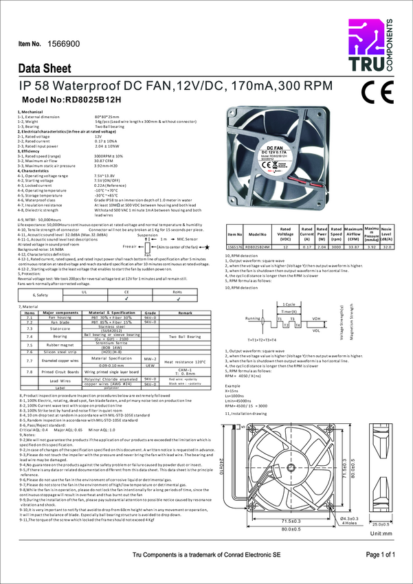 Wentylator osiowy TRU COMPONENTS RD8025B12H, 12 V/DC, 57 m³/h, (D x S x W) 80 x 80 x 25 mm
