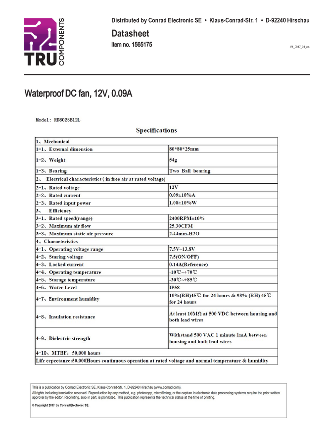Wentylator osiowy TRU COMPONENTS RD8025B12L, 12 V/DC, 42 m³/h, (D x S x W) 80 x 80 x 25 mm