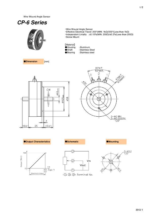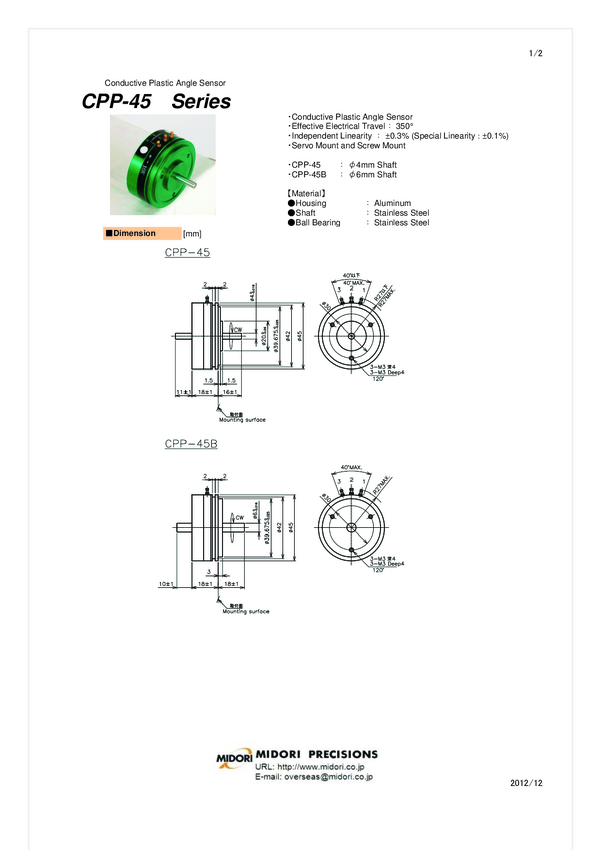Potencjometr przew.plastyk; Servo 18 + śruby; kąt el. 340 st ; kąt mech.360 st; 1 obrotowy; śr.45mm; gł.18mm; ośka 6mm dł .16 mm; RS 11mm; wypr.z boku; lin 0,5%; tol.10% 3W/70 st 3 x M3 120 st fi 30; 5 kohm Conductive Plastic Angle Sensor; Servopotentiometer; Resistance 5 kohm; Effective electrical travel 350 deg machanical travel 360 deg; Linearity 0,5%; Shaft Fi 6,00 mm - 18mm + Rear shaft 6,00 mm 10 mm; Diameter 45 mm ; 18mm deep; Tol. 10%; 3W/70 deg; 3xM3 120 deg fi.30mm Nastę[ca CP-45FB 5K Midori