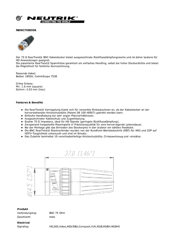Złącze BNC Neutrik RearTwist NBNC 75 BDD 6