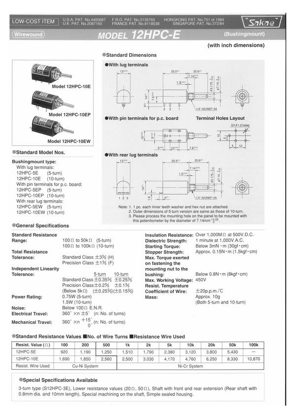 Potencjometr drutowy; bushing; tolerancja=0,35% 5 obrotowy; średnica=14mm; ośka=1/8"=3,15mm; rear lug termin Produkcja firmy SAKAE; na zamówienie wersje podobne