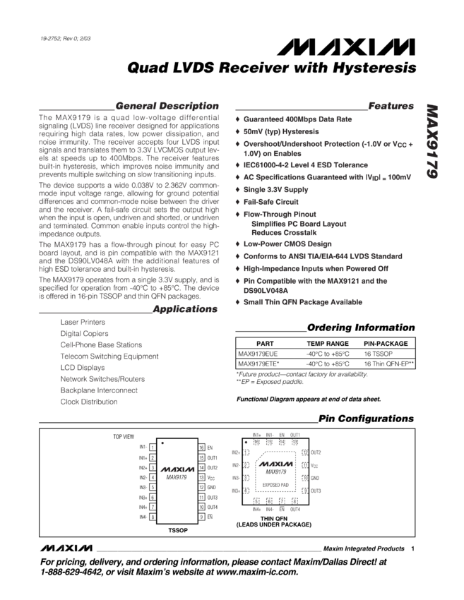 MAX9179 Quad LVDS Receiver with Hysteresis